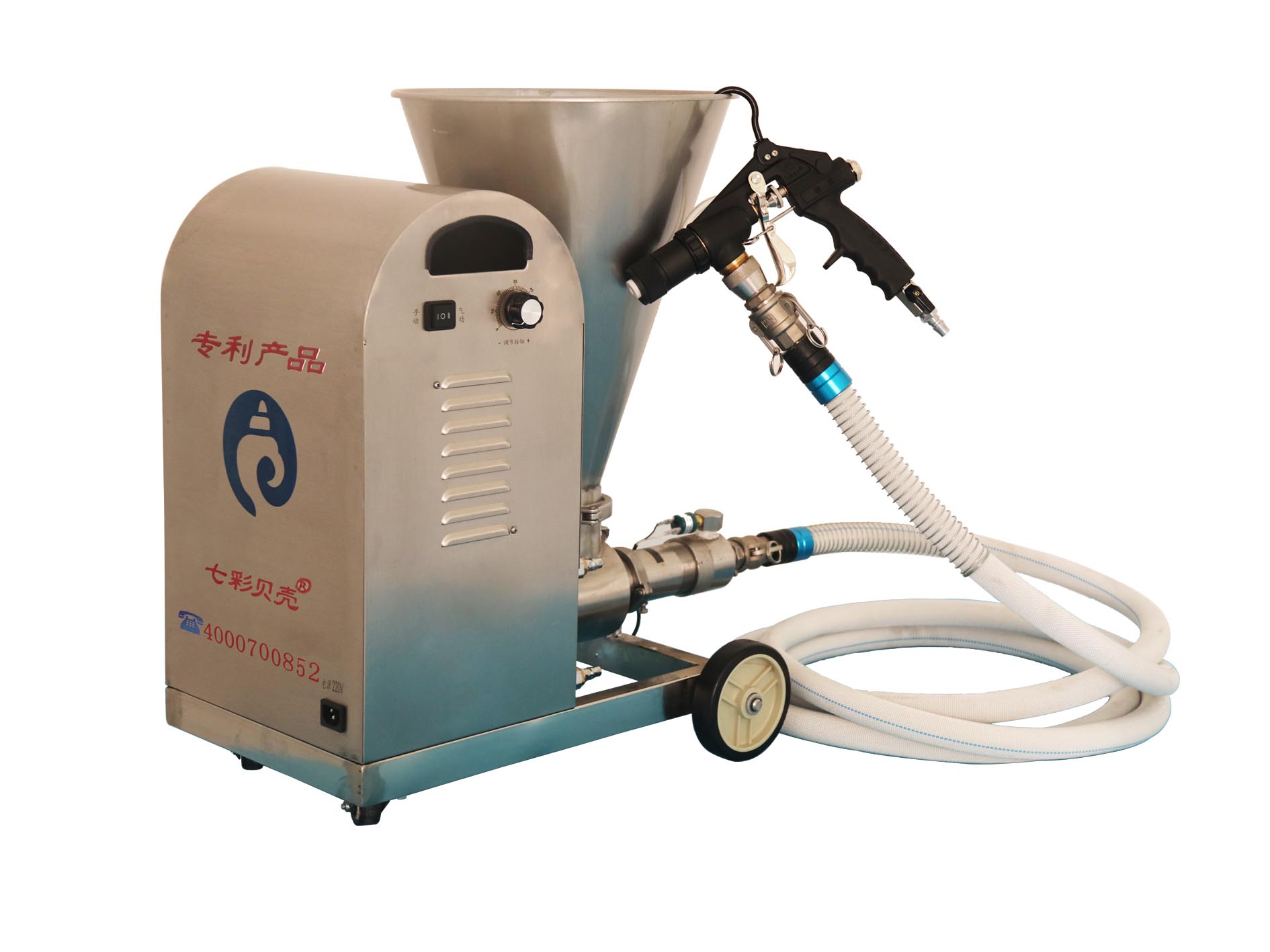 輸料管標配五米,噴槍標配三把噴槍?筛鶕(jù)不同材料不同效果更換噴槍使用。