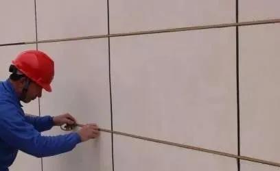 膩?zhàn)邮┕ね辏克⒖箟A封閉底漆后,可進(jìn)行分格縫工序。根據(jù)設(shè)計(jì)的分格大小,用彈線的方式在墻面上畫分格。