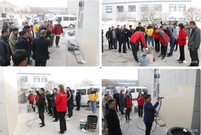 培訓(xùn)現(xiàn)場,七彩貝殼集團以集團的SG-6人工智能噴涂機、SG-9大流量砂漿噴涂機為例,向現(xiàn)場的工人進(jìn)行了真石漆、保溫顆粒的噴涂演示,并就機器的基本操作問題進(jìn)行了詳細(xì)的講解,現(xiàn)場的工人紛紛進(jìn)行現(xiàn)場操作,并對機器的噴涂效率、機器的智能化水平給予了充分肯定。